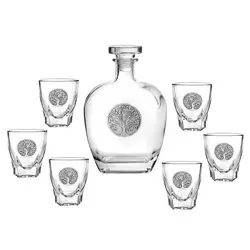 Сет за аперитив, състоящ се от 6 бр. чаши и бутилка от стъкло с ефектна декорация, изработена от сплав от сребро и калай върху тях . Бутилката е със стъклена масивна запушалка. Вместимост на бутилката 700 мл, h=19 см. Вместимост на чашите 50 мл, h=6 см. Комплектът се предлага в подаръчна кутия, облицована отвътре със сатен.