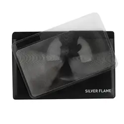 Тънка лупа тип „карта“ с 3-кратно увеличение и елегантен калъф. Размери на лупата: 85×53×0.4 мм. Материал: оптична леща с пластмасова рамка. Цвят на каъфа: черен с бяло лого Silver Flame