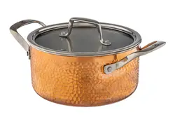 Медния слой от вън патинира с времето, връщайки ни в миналото, а скритата под него алуминиева подложка покрита с благородна неръждаема стомана 18/10 за контакт с храна е изработена по свръхмодерна технология. Този трислоен материал и индукционното дъно пренасят топлината равномерно и предпазват от загаряне.