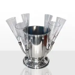 Изящна метална лидиера с инкрустиран грозд в комплект с 6 бр. чаши за бяло вино. Сетът определено се откроява като иновативен подарък, поради възможността си чашите да се поставят в специални стойки около съда за лед. Комплектът се предлага в бяла картонена кутия. Сетът е произведен в Португалия от „Freitas & Dores“.