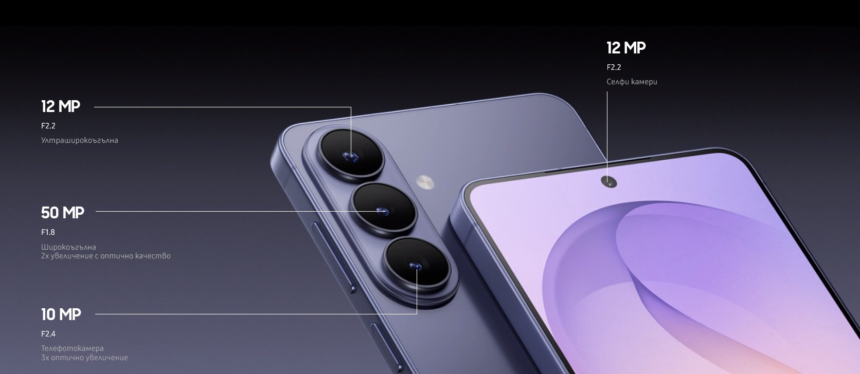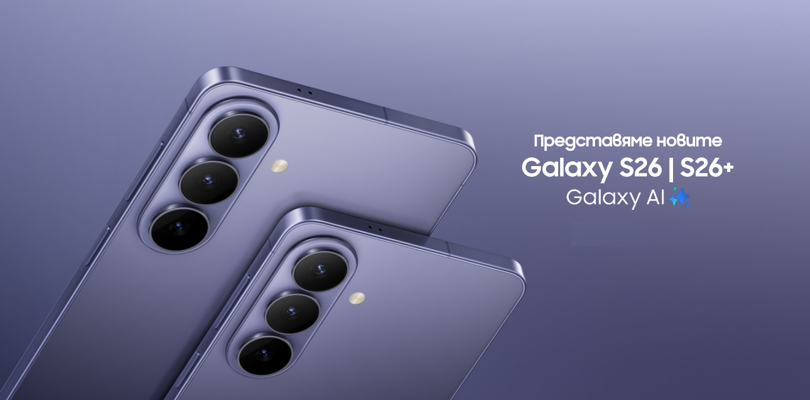 От епични търсения до игри с много участници в реално време, персонализираният процесор осигурява светкавична скорост и захранва персонализирано подобрение на картината, което помага на съдържанието да изглежда ясно и живо.В допълнение на това, подобреният в работата с 38% усъвършенстван NPU и 23% по-плавни графики те поддържат напред в играта ти.Виж пълния спектър.Подобрено представяне на цветовете и светлината от нашата усъвършенствана технология с mobile Digital Natural Image engine (mDNIe) осигурява 4 пъти по-добра прецизност на обработката за по-богати тонове.Това води до значително подобрение на графичната производителност.ProScaler също така придава на всяко изображение въздействието, което заслужава, благодарение на подобренията в обработката с AI, осигурявайки реалистични детайли за завладяващо изживяване.Не прегрявай, когато действието се разгорещява.Преработеният Vapor Chamber и персонализираният термоинтерфейсен материал (TIM) поддържат високопроизводителния персонализиран процесор по време на натоварващи сесии.Чрез разпределяне на топлината по-ефективно, те осигуряват до 29% подобрено разсейване на топлината за по-хладна работа.Допълнително подкрепено от проследяване на лъчите и оптимизация Vulkan, твоето устройство поддържа максимална производителност, докато гледаш часове видеоклипове, и предоставя плавни визуализации и светкавично бързо представяне, без усилие.Твоят ден, без прекъсвания.Бързо зареждане с кабел те връща към пълна мощност за нула време – до 69% заряд за около 30 минути – и те поддържа в ритъм.Galaxy S26 и S26+ се предлагат с 12 GB памет и две опции за място за съхранение: 256 GB или 512 GB, за да можеш да избереш капацитета, който отговаря на начина, по който използваш телефона си.Избери 256 GB, за да съхраняваш любимите си снимки и важни приложения за ежедневна употреба.Или надгради до 512 GB, ако обичаш да играеш игри, да правиш често снимки с висока резолюция или да изтегляш по-големи приложения, без да забавяш телефона си.От градските светлини до светлината на свещите, Nightography позволява на нощите да блестят, за да можеш да уловиш специалните моменти по-ясно.Системата от камери от следващо поколение улавя по-широк динамичен диапазон, гарантирайки това сенките и светлите точки да останат ясни и ярки.Усъвършенстваната AP осигурява намаляване на шума въз основа на индивидуални шумови модели, уникални за всеки тип сензор, осигурявайки кадри, които изглеждат естествени и кинематографични дори при условия на слаба светлина.Задвижвана от ProVisual Engine, усъвършенстваната 50 MP камера издига всеки кадър, подобрявайки обектите ти с по-интелигентни детайли, по-богати цветове и яснота, които са следват въображението ти.Новата функция на Super Steady Хоризонтално заключване комбинира разширени оптични ъгли с жироскопични сензори и такива за ускорение, за да разпознае посоката на гравитацията и да държи кадрите ти равни, дори ако завъртиш на пълни 360°.Независимо дали си по скалисти пътеки или тичаш, получавай по-плавни видеоклипове без трептене всеки път.Предните камери на Galaxy S26 и S26+ вече разполагат с Процесор за обработка на сигнали за изображения с AI (ISP) за по-естествени селфита с акценти и сенки там, където трябва да бъдат — съответстващи на естествения тен на кожата ти и други детайли като коса и вежди, точно както очите ти ги виждат.Бързо и лесно редактиране на с