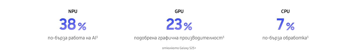 16. Подобренията в производителността на процесора за приложения се отнасят за Galaxy S26+ и са сравнени с Galaxy S25+. Действителната производителност зависи от потребителската среда, условията и предварително инсталираните софтуер и приложения.