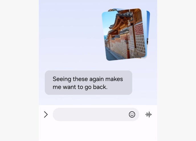 Задвижвана от Galaxy AI, изцяло нова функция Now Nudge може да разпознае контекста на екрана ти и да те насочи с полезни преки пътища. Тя интелигентно намалява до минимум стъпките до следващото ти действие и дори предоставя предложения за автоматично попълване. Снимките могат да бъдат намерени и изпратени по-лесно. Ако някой поиска снимки от скорошно пътуване, Now Nudge ще разбере кои снимки ще ти трябват и ще ги намери вместо теб. След това ще те отведе до тези конкретни снимки в Gallery, което ще ти позволи да ги избереш и изпратиш само с няколко докосвания.26