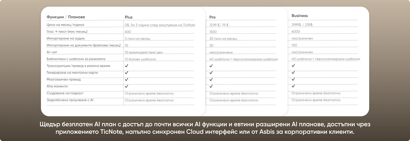 • TicNote е първият AI рекордер с интегриран AI агент, който използва най-добрите AI модели за транскрипция, превод на 120 езика, структуриране, обобщения и анализи на вашите срещи или лекции.