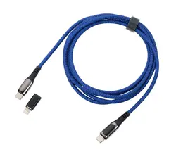 Високоскоростен кабел за зареждане, USB-C 100W PD, с функция за предаване на данни, пълен капацитет на зареждане: макс. 100W|20V|5A (без адаптер), в зависимост от устройството, което ще зареждате, с дигитален дисплей за мощността на зареждане, вкл. Адаптер USB-C към Lightning, кабел с текстилно покритие (мрежеста структура), рециклиран полиестер, дължина 2 м, метал / полиестер, син