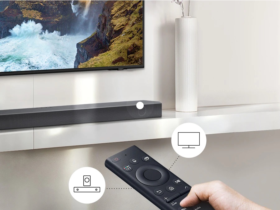 Саундбарът се синхронизира с твоя телевизор Samsung и заедно създават завладяващ звук.