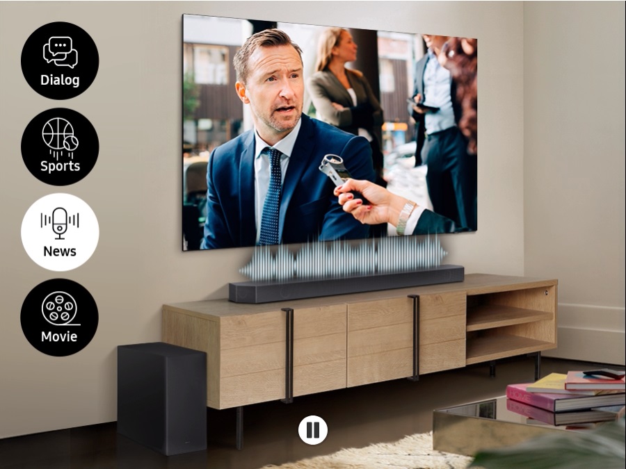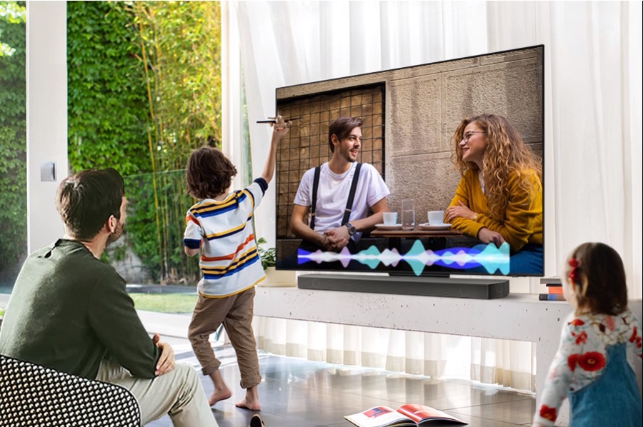Саундбарът на Samsung анализира звуковия сигнал, за да оптимизира автоматично аудиото спрямо всяка сцена. Адаптивният звук ти позволява да чуваш ясно гласовете и при ниска сила на звука, така че да се чуват дори тихи разговори.