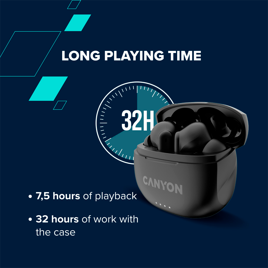 Have you already tried true wireless earphones? There is a chance you won’t look back with these Canyon earbuds 13 mm speakers will bring joy to your ears, offering a balanced sound profile. Not only music – these earphones make a great companion for calls and conferences. Four microphones work together to provide environment noise cancellation. Whether you are on a call or just in a noisy environment – this technology helps you to hear and be heard. These earphones boast an impressive battery life, offering up to 7.5 hours of playback on a single charge. When combined with the charging case, you can enjoy up to 32 hours of use. The case can be fully charged in just two hours using any Type-C cable. We use the latest Bluetooth protocol, which is dependable and energy-efficient. It will maintain a stable connection with your phone or other devices. Plus, the low latency of 50 ms makes these earphones quite good for gaming. Lightweight and ergonomic, they are almost imperceptible to the ear. We added earcaps in three sizes to make the fit ideal for you.