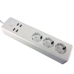 Разклонител с максимален товар 10А, 3 гнезда, 4 USB изхода х 5V, връзка с WiFi и управление през апликация. Възможно е едновременно включване на целия разклонител чрез бутона, както поединичното включване и изключване на всяко от гнездата тип "шуко" или четирите USB заедно през смартфон. Включвайте и изключвайте светлината, когато не сте в къщи или задайте сценарии чрез апликацията. Включете кафе-машината към разклонителя и задайте час, за да се събудите например с ароматно кафе.