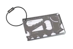 Етикет за багаж и карта с инструменти с 22 функции, две записваеми адресни карти, вкл. телена примка за закрепване, сантиметрова/инчова линийка, плоска отвертка, отварачка за консерви, белачка, шестостенен ключ, отварачка за писма, отварачка за колети, отварачка за бутилки, транспортир, неръждаема стомана 420/алуминий, сив