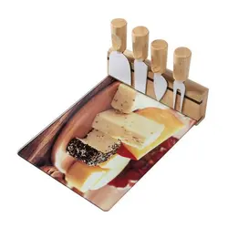 Комплектът включва: Нож за пармезан,вилица за сирена, нож за меки сирена, нож за твърди сирена, подложка за рязане от темперирано стъкло с дървена поставка и магнитен държач за ножовете. Размери : дълж.18см.,шир.25см.