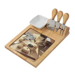 Комплектът включва: Нож за пармезан, нож за меки сирена, нож за твърди сирена, порцеланова купичка , 4бр. метални клечки за сирена подложка за рязане от темперирано стъкло, дървена поставка с магнитен държач за ножовете. Размери :дълж. 22см.,шир. 30см.