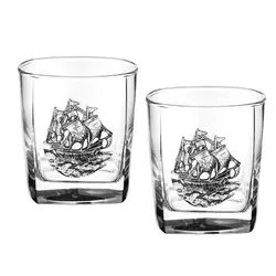 Сетът се състои от 2 бр. чаши за уиски от кристално стъкло с квадратен дизайн. Стилна декорация от сплав от калай и сребро във формата на детайлно инкрустиран кораб. Произведени в Португалия от „Freitas & Dores“. Комплектът се предлага в луксозна синя дървена кутия, облицована отвътре със сатен.