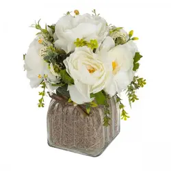 Преобразявайте всяко пространство в оазис от спокойствие с нашата Аранжировка бели божури. Ръчно изработена от висококачествени изкуствени божури, тази великолепна композиция носи безвременна красота без грижите за пресни цветя.