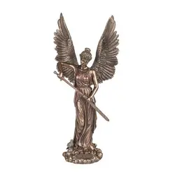 Ангел е свръхестествено, безсмъртно, разумно същество, изразяващо волята на Бога и притежаващо нечовешки умения и възможности (способност да бъде невидим, способност да лети, ясновидство, способност да унищожава цели градове). В представите на съвременните хора ангелите обикновено са хвъркати и безполови, в одежди и крила с бял цвят, символ на невинност. Вярва се, че има ангели, които закрилят места, народи или отделни хора. През Средновековието става разпространено схващането, че след тайнството на кръщението, човек получава ангел пазител до себе си, който бди над него през целия му земен път, стои зад дясното му рамо и говори с гласа на съвестта. Статуетката е изработена прецизно от полирезин с покритие от метал и с внимание към всеки детайл. Размери на статуетката: h 35 см