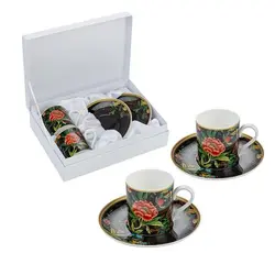 Комплекта се състои от два броя чаши и два броя чинийки изработени от супер фин костен порцелан. Размер на чашите : височина 6 см. ; Ø 5.5 см. ; вместимост 70 мл. Размер на чинийките: Ø 13 см. Предлага се в стилна подаръчна кутия.