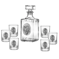 Чаши: Ø 7,2 см. , Височина чаши: 8,2 см. Височина бутилка: 24 см. Вместимост Чаши: 200 мл. Вместимост Бутилка: 1000 мл. Стилен сет за аперитив от бутилка и 6 бр. чаши, изработени от стъкло. Съдът за спиртни напитки е с класическа строга квадратна форма, която внася стил и традиция в поднасянето на напитката. Акцент е масивната стъклена запушалка. Комплектът е декориран с фина гравюра от сплав от калай и сребро във формата на метален грозд с листа. Произведен от Artina, Австрия. Предлага в луксозна синя подаръчна кутия.