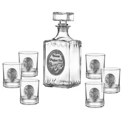 Сет за алкохол от стъкло, издържан в класически стил, състоящ се от 6 бр. чаши и четвъртита бутилка с масивна стъклена запушалка. Този строг дизайн завършва визията си с изящно инкрустиран метален грозд с листа от калай и сребро и гравюра „Честит Рожден ден“, което го превръща в луксозно празнично предложение, обогатяващ етикета на сервиране на качествени напитки. Произведен от Artina, Австрия. Сетът се предлага в луксозна синя подаръчна кутия с размери: 37 см дължина; 34 см ширина; височина 11 см. Височина бутилка 24 см, височина чаши 8,5 см. Вместимост на чашите 200 мл.