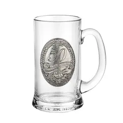 Оригинална халба за бира от стъкло с удобна дръжка. Семпла декорация-плочка от метална сплав от калай и сребро и празнична гравюра „50“. Произведена в Австрия. Размери: Ø 8 см. , височина на халабата - 15 см. , вместимост на халбата - 500 мл.