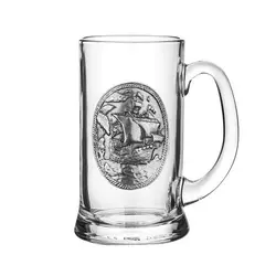 Оригинална халба за бира от стъкло с удобна дръжка. Изящна живописна декорация-плочка с детайлен кораб от калай и сребро. Произведена в Австрия. Размери: Ø 8 см ,височина - 15 см. , вместимост - 500 мл.