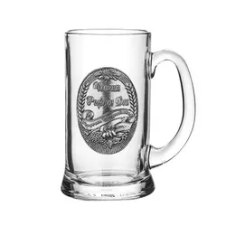 Оригинална халба за бира от стъкло с удобна дръжка. Семпла декорация - плочка от метална сплав от калай и сребро и гравиран празничен надпис „Честит Рожден ден“. Произведена в Австрия. Размери: Ø 8 см , h= 15 см, вместимост 500 мл.