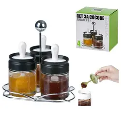 Комплектът включва: 3 бурканчета от прозрачно стъкло с капак, лъжичка и поставка. Размери: /16.5x15.5x16.5/