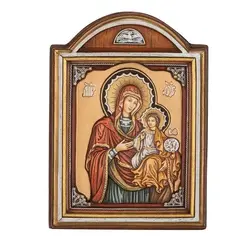 Релефна икона, изработена върху дърво, ръчно изрисувана с висококачествени материали. Размери: 17 х 13 см.