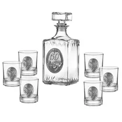 Сет за алкохол от стъкло, издържан в класически стил, състоящ се от 6 бр. чаши и четвъртита бутилка с масивна стъклена запушалка. Този строг дизайн завършва визията си с изящно инкрустиран метален грозд с листа от калай и сребро и юбилейна гравюра „50“, което го превръща в луксозно празнично предложение, обогатяващ етикета на сервиране на качествени напитки. Произведен от Artina, Австрия. Сетът се предлага в луксозна синя подаръчна кутия с размери: 37 см дължина; 34 см ширина; височина 11 см.Размери : Чаши: Ø 7,2 см Височина на чаши: 8,2 см Височина на бутилка: 24 см Вместимост на чаши: 200 мл. Вместимост на бутилка: 1000 мл.