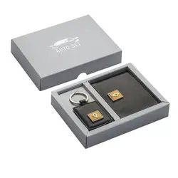 Автомобилен сет, включващ ключодържател и калъф от естествена кожа с лого. Размери: калъф за документи: 10*8 см, ключодържател: 9.5 см