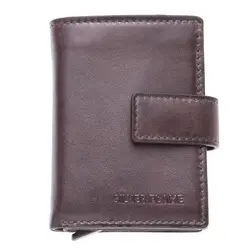 Мъжки портфейл от естествена кожа, външна закопчалка, отделения за карти и документи, отделение за банкноти, допълнително отделение за карти с автоматично изваждане на картите. Размери: 7 / 9,5 / 2,5 см.