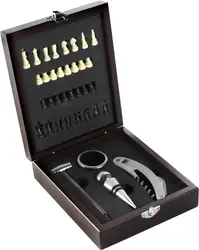Комплект за вино в луксозна дървена подаръчна кутия. Комплекта включва шах, тирбушон, термометър, тапа и капкоуловител.