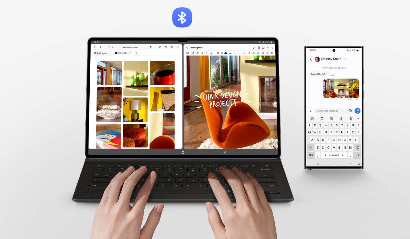 С функцията Wireless Keyboard Sharing можеш лесно да се свързваш с другите си устройства Galaxy и безпроблемно да пишеш или да ги управляваш. Превключвай устройствата с лекота и управлявай телефона си така, както би управлявал своя таблет.