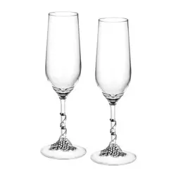 Сетът се състои от 2 бр.чаши за шампанско от кристално стъкло. Детайлната декорация от сплав от калай и сребро във формата на грозд върху столчето на чашите им придават елегантност. Произведени в Португалия от „Freitas & Dores“. Комплектът се предлага в луксозна синя дървена кутия, облицована отвътре със сатен.