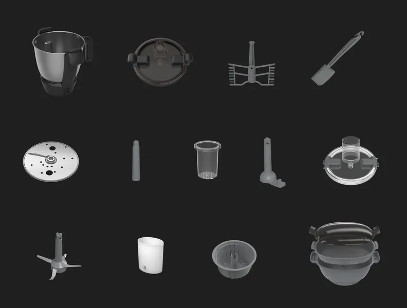 Купа с обем 3.5 л (полезен обем – 2.3 л), капак на купата, бъркалка, шпатула, диск за рязане с 2 страни, държач за ножове, бутало, приставка за смесване, капак на кухненския робот, нож за нарязване с 4 остриета, мерителна чаша (30 мл), малка кошница за пара, капак на кошницата за пара, вложка за кошница за пара, кошница за пара