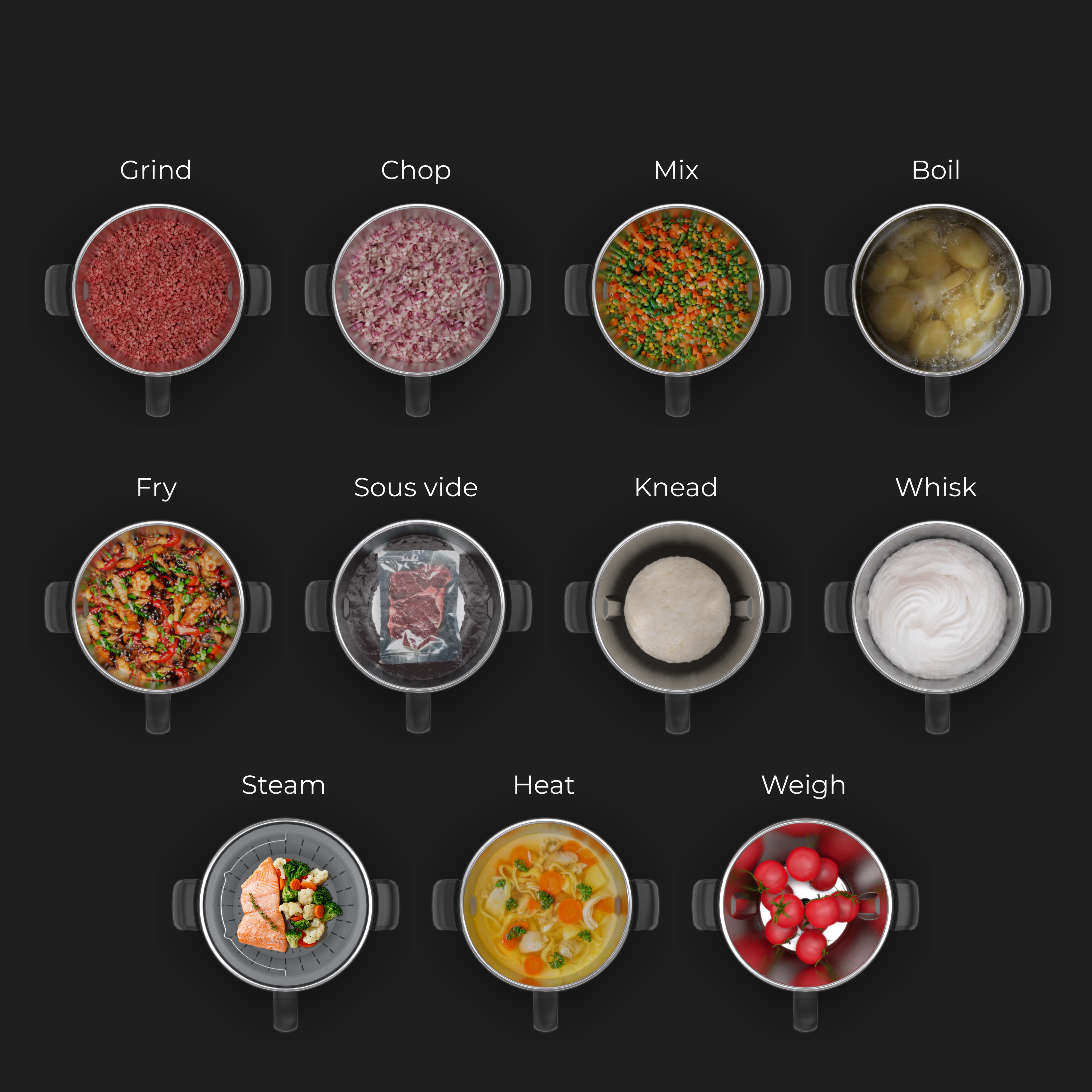 | Automatic Programs | Steam Slow Cook Chop Food processor Turbo Weigh Boil water Khead Dough |