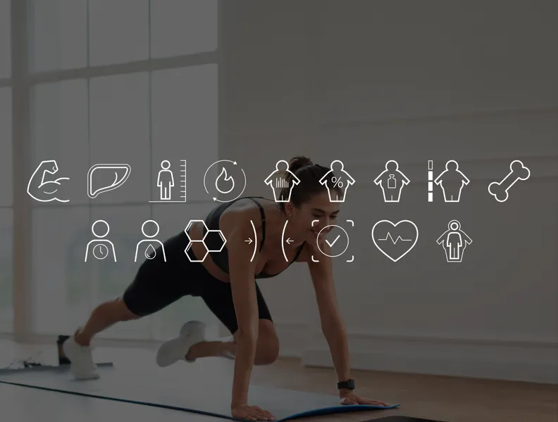 Мускулна маса, индекс на висцералните мазнини, BMI (индекс на телесната маса), BMR (базална скорост на метаболизма), скорост на телесните мазнини, индекс на телесните мазнини, маса на телесните мазнини, ниво на затлъстяване, костна маса, метаболитна възраст, вода в тялото, скорост на протеина, контрол на теглото, идеално тегло, сърдечен ритъм, тегло без мазнини
