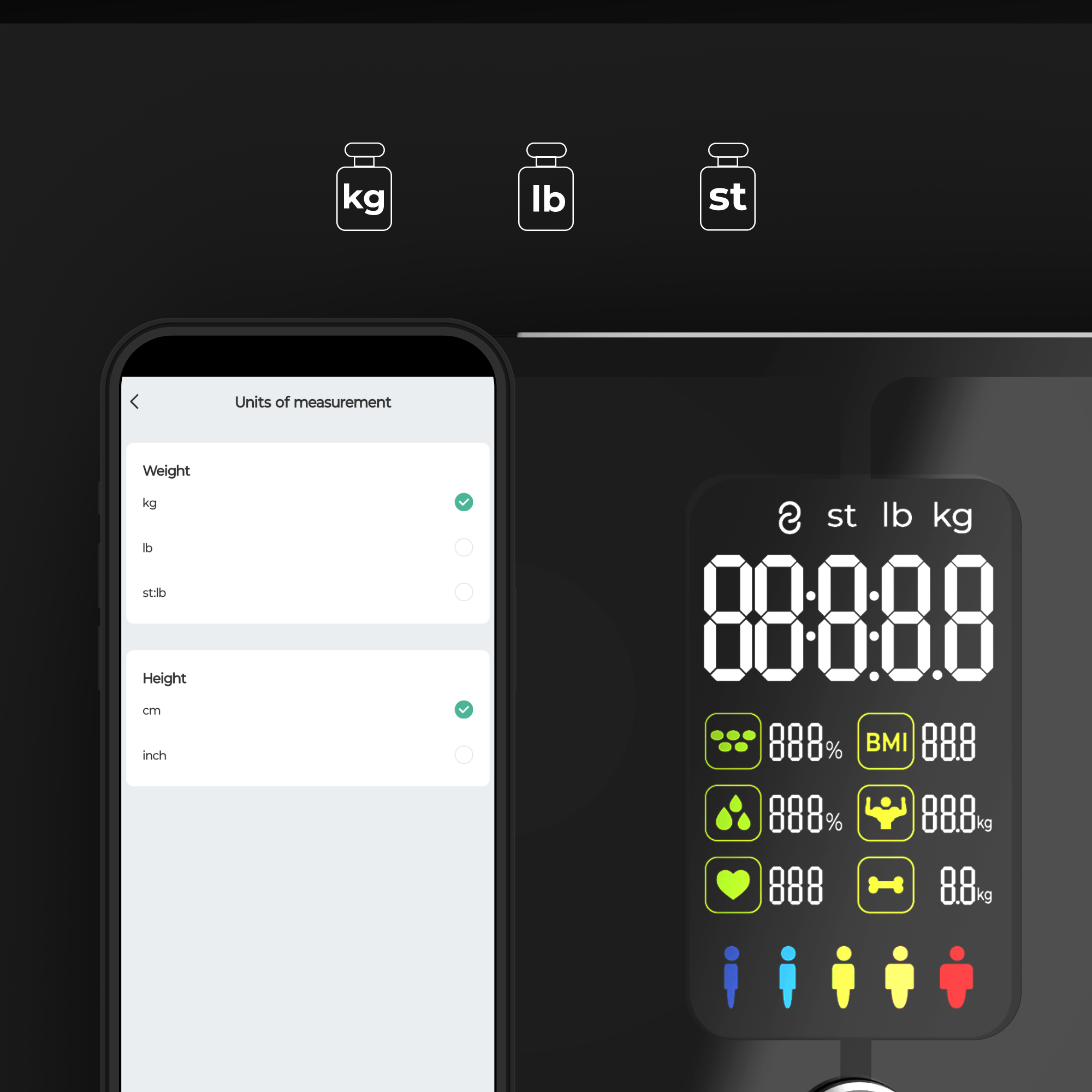 Гъвкавостта е от ключово значение в днешния глобален свят. Нашите кантари предлагат конвертиране на три мерни единици - kg, lb, st - което ви позволява да изберете най-подходящата за вас система за измерване. Тази функция е особено удобна за тези, които пътуват често или предпочитат конкретна мерна единица
