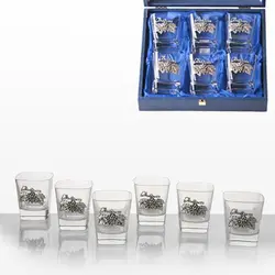 Сетът се състои от 6 бр. чаши за уиски от кристално стъкло с квадратен дизайн и високо дъно. Изящна декорация от сплав от калай и сребро във формата на детайлен грозд с листа. Произведени в Португалия от „Freitas & Dores“. Комплектът се предлага в луксозна синя дървена кутия, облицована отвътре със сатен.