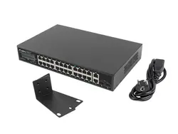 - Портове: 24x 1GbE PoE+ (30W/порт), 2x 1GbE uplinks, 2x SFP