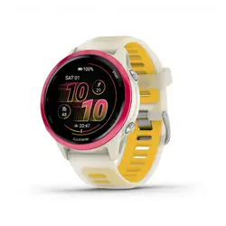 Подобрете вашата фитнес рутина с Garmin Forerunner® 570 – стилен и мощен GPS часовник, създаден за спортисти, които търсят прецизност и елегантност. 42-милиметров корпус в Raspberry Aluminium с каишка Translucent Bone/Mango предлага лек и модерен дизайн, идеален за цялодневно носене.