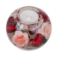 Стъклен свещник с красива вътрешна декорация.Включва чаена свещ. Размери: 8 x 9 см.