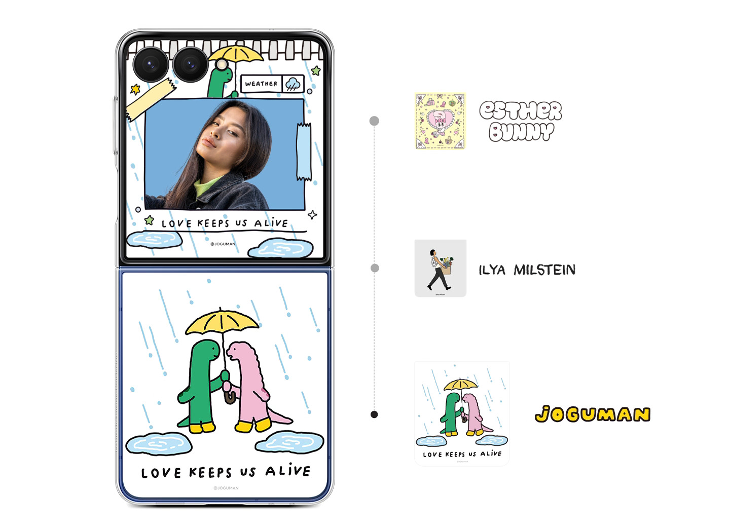 Разгледай разнообразие от колаборации с други марки с калъфа Flipsuit за Galaxy Z Flip7 и открий любимата си Flipsuit карта. Сменяй лесно картите Flipsuit, за да покажеш своето уникално основно съдържание или фоторамка. 4